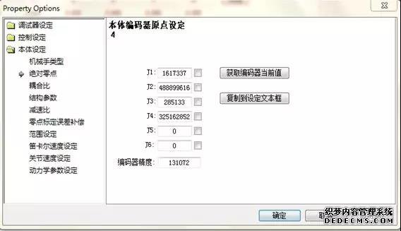 工具栏——项目——机械手设定——用户登录(密码:admin)——本体设定——绝对零点——将需要标零点的轴勾选上——获取编码器当前值——复制到当前文本框——应用——确定