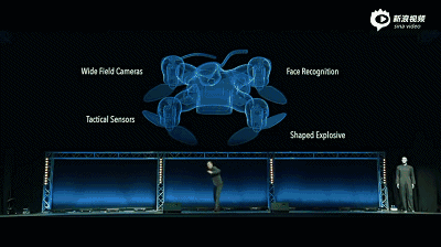 视频中还公布了两段令人惊悚的画面,一个是由小型“杀手机器人”被用于击杀罪犯的画面;另一个则是一群“杀手机器人”在恐怖分子的操控下,飞入一间教室,并通过面部识别杀死教室中的学生,场面一度十分血腥。
