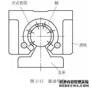 目前第五种滚动导轨在工业机器人中应用最为广泛,如图2-15所示为包容式滚动导轨的结构,用支承座支承,可以方便地与任何平面相连,此时套筒必须是开式的,嵌入在滑枕中,既增强刚度也方便了与其他元件的连接。