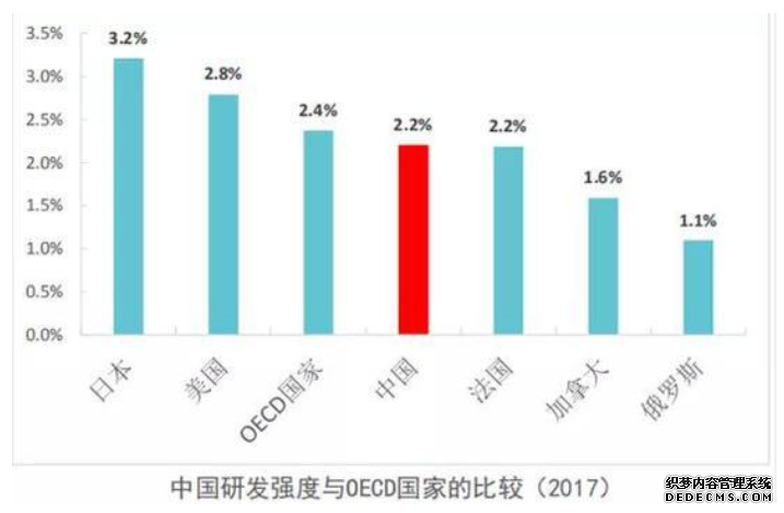 这意味着,横向比较,中国制造业的平均研发强度已经与法国等发达国家持平,接近OECD国家的平均水平。但这一数据,距离美国(2.8%),日本(3.2%)仍有一定差距。
