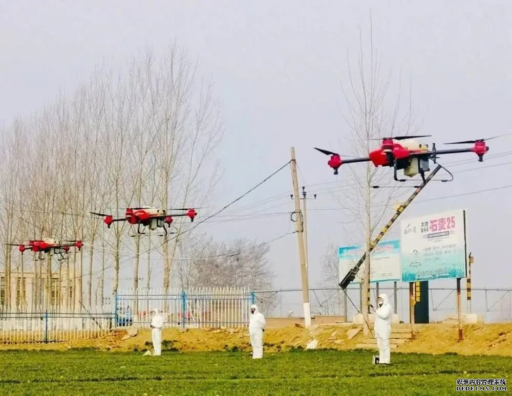 为了确保全镇 3.5 万亩油菜、3.7 万亩小麦丰产丰收工作抓紧落实,当阳市河溶镇政府实行了一个统防统治的办法,从专业植保合作社调集了 18 台植保无人机,进行无人机飞防,每天作业量可以达到 15000 亩左右,不到一周就可以把镇上的油菜、小麦全部进行一次统治。