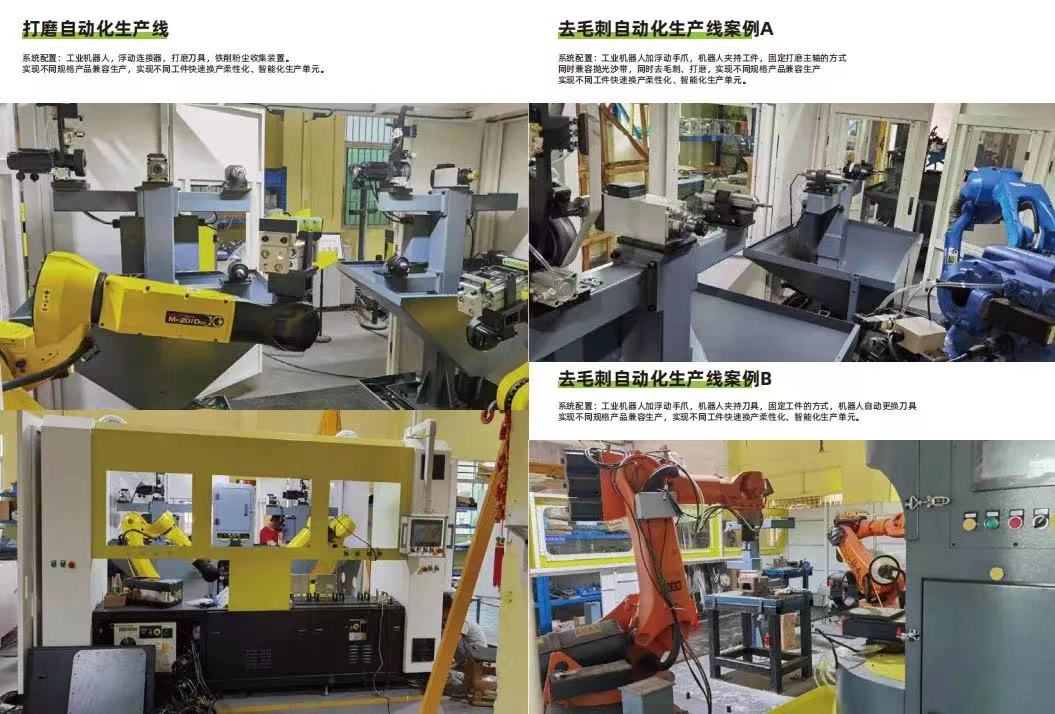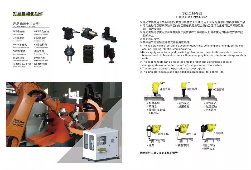 系统配置:电主轴、气动主轴、锉刀机、角磨机、砂光机、浮动机构、砂带机、组合工具、耗材库、抛光机、机器人工作站、数控机床
