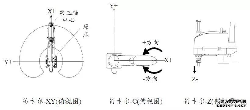 笛卡尔直角坐标系:两条数轴互相垂直的笛卡尔坐标系;包括左手笛卡尔坐标系和右手笛卡尔坐标系两种。LinkHou SCARA机器人笛卡尔直角坐标系遵循右手笛卡尔坐标系,以三维数据描述机器人末端在空间的位置