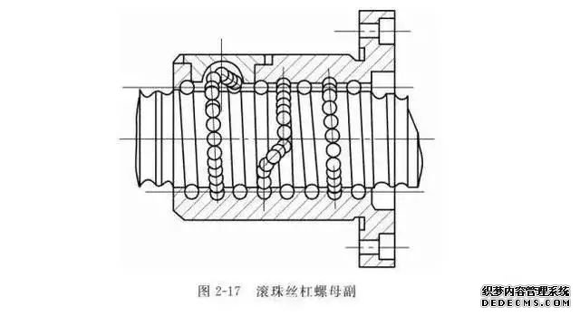 如图2-17所示滚珠丝杠螺母里的滚珠经过研磨的导槽循环往复传递运动与动力,滚珠丝杠的传动效率可以达到90%。