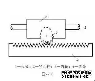 齿轮齿条装置中(图2-16),如果齿条固定不动,当齿轮转动时,齿轮轴连同拖板沿齿条方向做直线运动。这样,齿轮的旋转运动就转换成拖板的直线运动。拖板是由导杆或导轨支承的,该装置的回差较大。