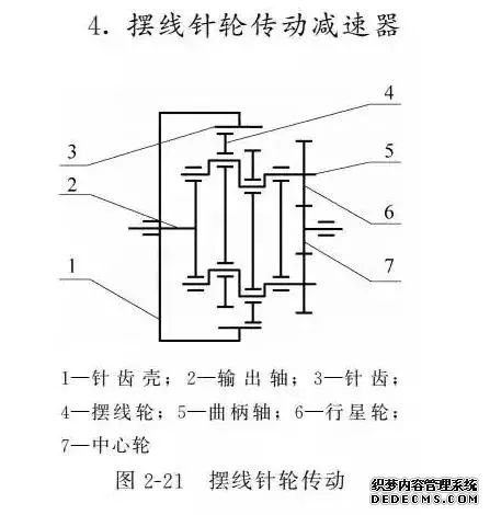 如果渐开线中心轮7顺时针旋转,那么,渐开线行星齿轮在公转 的同时还逆时针自转,并通过曲柄轴带动摆线轮做平面运动。此时,摆线轮因受与之啮合的针轮的约束,在其轴线绕针轮轴线公转的同时,还将反方向自转,即顺时针转动。同时,它通过曲柄轴推动行星架输出机构顺时针转动。