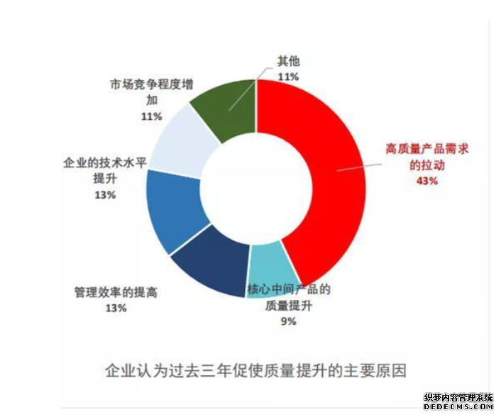 企业对于质量的重视源于民众消费需求的升级。在问及促进企业提升质量的动力时,43%的企业表示其质量提升第一位的因素是产品需求的拉动,高于技术、管理、市场竞争等原因。